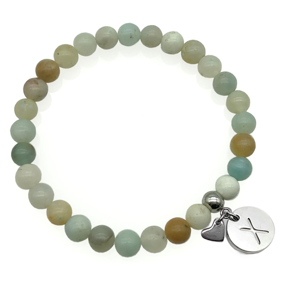 Natural Round Amazonite & Personalized Letter `X` with Heart Charm Stainless Steel Fine Jewelry Beads Stretch Bracelet.