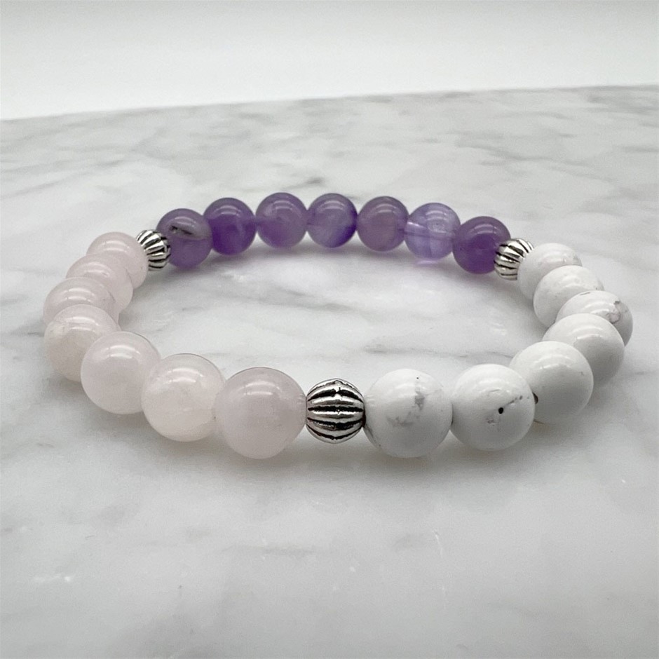 Natural Amethyst, Rose Quartz & Howlite Stretch Beaded Bracelet