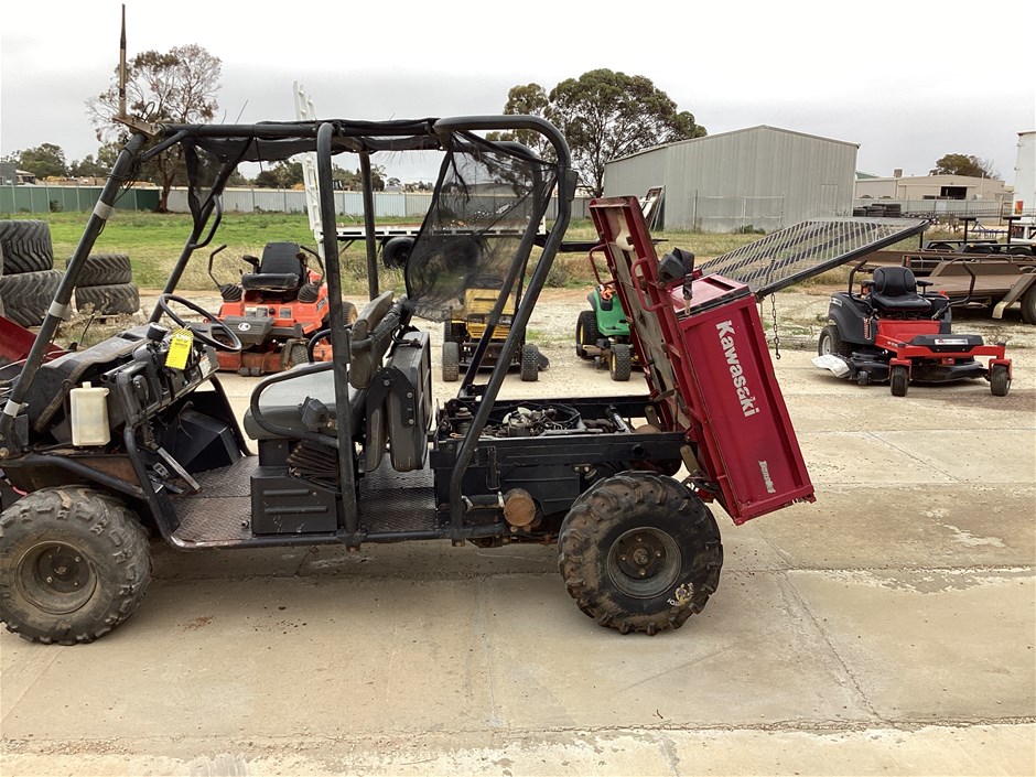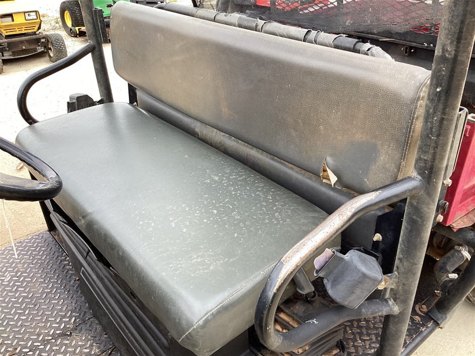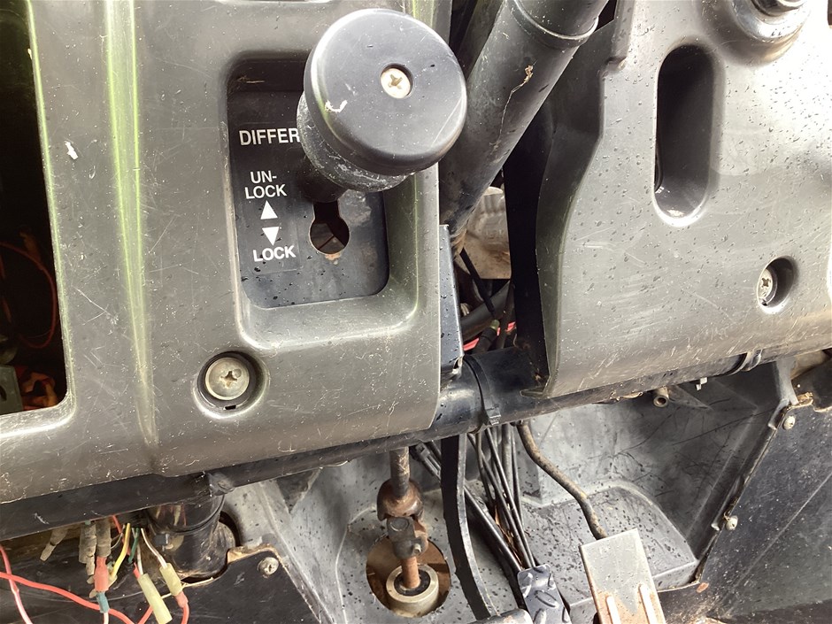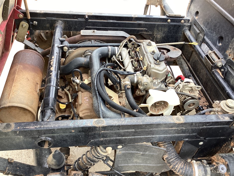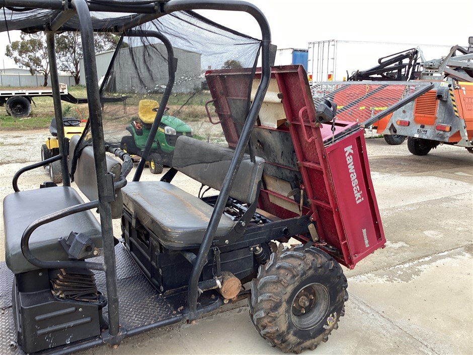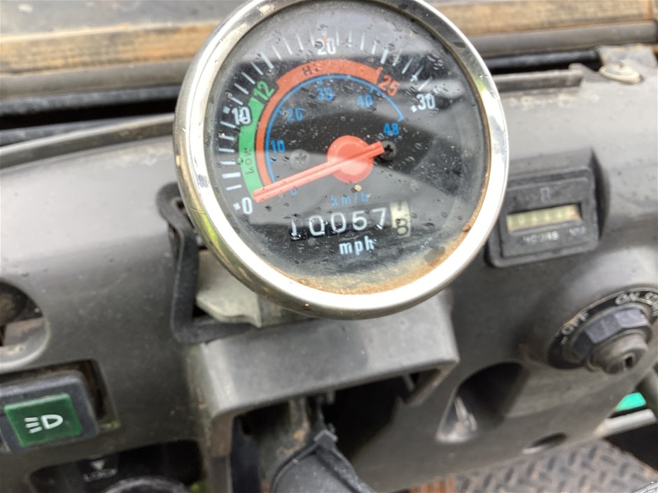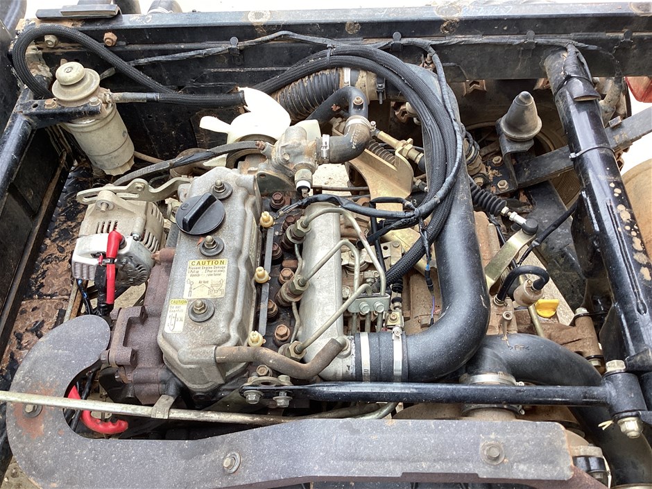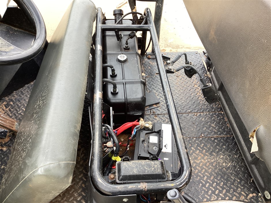 • 644 Hrs Showing, 10057 Kms Showing, high, low, reverse, uhf, ROPS, 4 seater, tow bar, rear seat folds up, manual tipping tub, powered by a 3 cyl 3.3L diesel engine, seat belts, 24x11-10 tyres, No Key, No Data Plate,