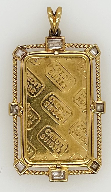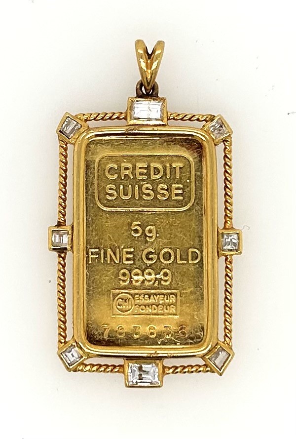 5 gram fine gold 999.9 ingot with 18ct gold twist rope 8 diamond surround, 6 x square cut diamonds bezel set & 2 x emerald cut diamonds bezel set, estimate total diamond weight 0.28ct pendant measures 3.7 x 2.2cm including bale, total weight 8.2 grams. This item has been professionally verified as a genuine product and comes with accompanying 3rd party Certificate of Authenticity (306178-291)