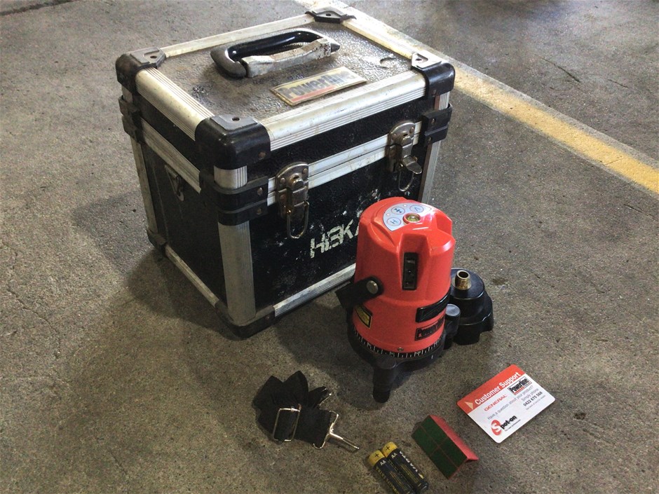 • Laser Class 2 .Red beam multi-line laser. Operating range 50m. Battery type : Alkaline. Battery life:10 H. Includes carry box Untested. Inspection recommended.