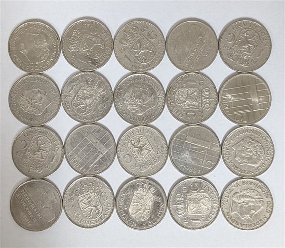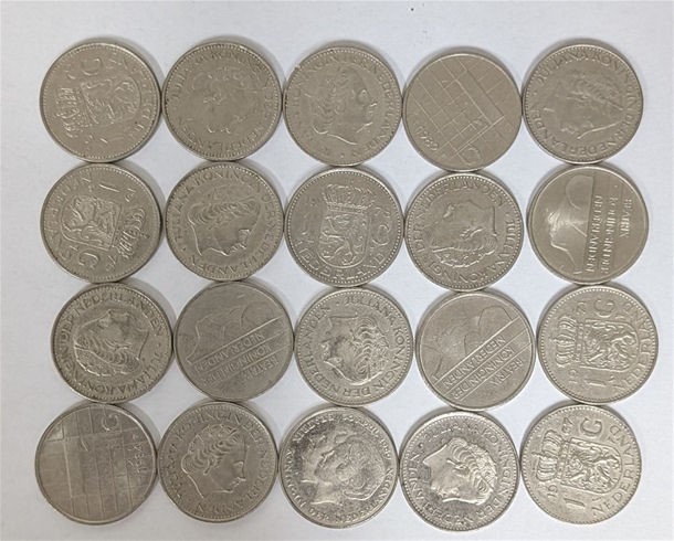Coin collection of 20 Dutch NETHERLANDS One Guilder Coins
