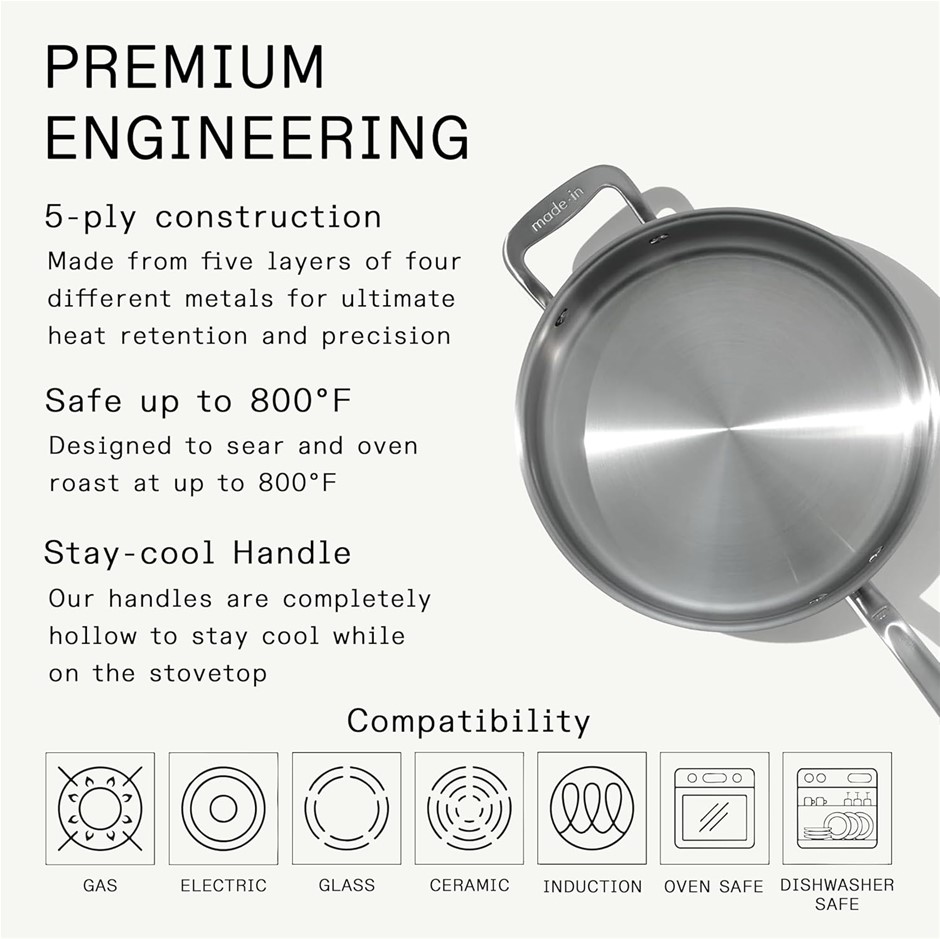 MADE IN COOKWARE 3.5 Quart Stainless Steel Saute Pan, 5 Ply Stainless Clad, Professional Cookware, Induction Compatible, Crafted in Italy. NB: Minor Use. (Code: B09R3CSHFD-MU) (332632-60)