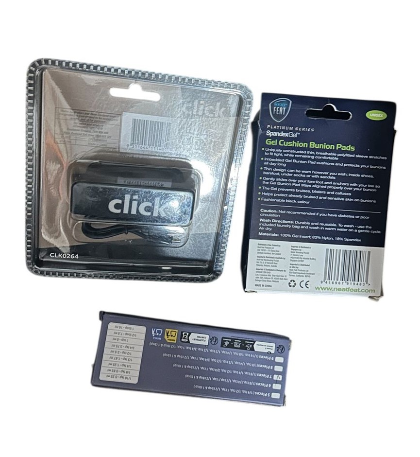 • 3x Assorted Products (1x Click LED Head Lamp, 1x Measuring Spoon Set, 1x Gel Cushion Bunion Pads)