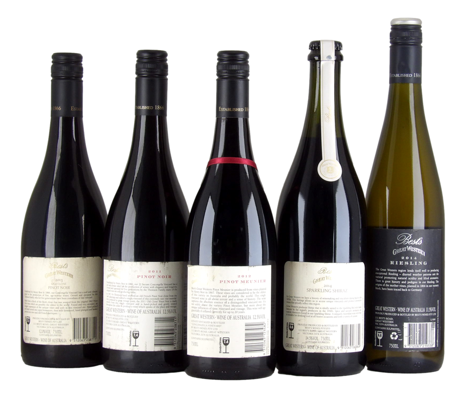 1x Bests Great Western Pinot Noir Old Clone 20111x Bests Great Western Pinot Noir Old Clone 20131x Bests Great Western Pinot Meunier Old Vine 20121x Best`s Great Western Riesling 20141x Best`s Great Western Sparkling Shiraz 2014