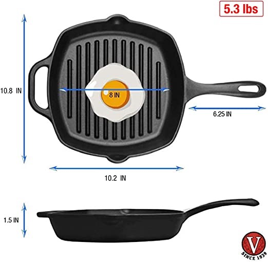 VICTORIA Cast Iron Square Grill Pan with Lines, 10 x 10 Inch, Seasoned. NB: Minor rust on left side and handle. (Code: B01726HE94-2) (140176-65)