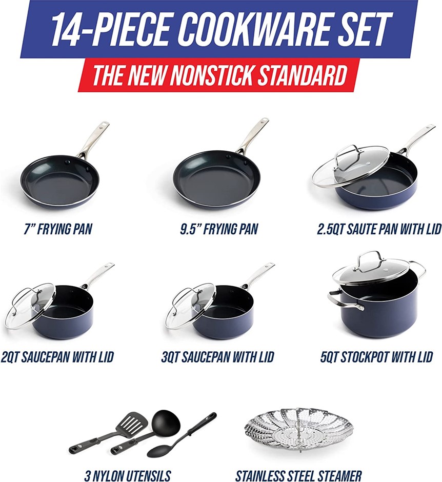 BLUE DIAMOND Cookware, Diamond Infused Ceramic, Nonstick 14 Piece Cookware Pots and Pans Set, Colour: Blue. NB: Not in original box (Code: B07HMGZSHJ-NOB) (140710-69)