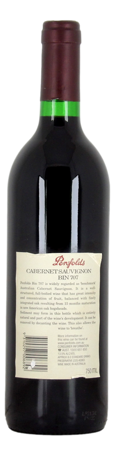 Over the years the development of Bin 707 Cabernet Sauvignon has mirrored the advances in winemaking and viticulture and in this sense has served as a representation of progress and excellence within the industry.Bin 707 proudly bears the Penfolds stamp – displaying a fascinatingly complex marriage of ripe, concentrated cabernet fruit and 100% new American oak, forged together through partial barrel fermentation. It displays dark berried fruit, mocha and chocolate overtones, with warm spice notes.