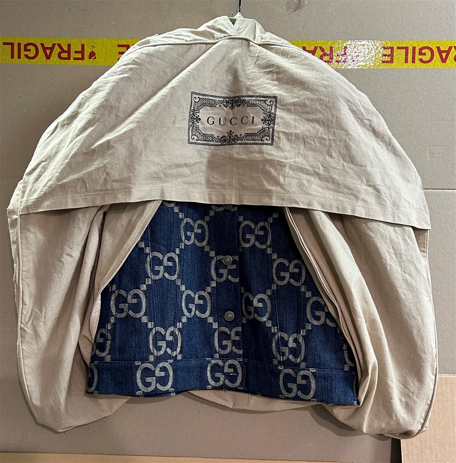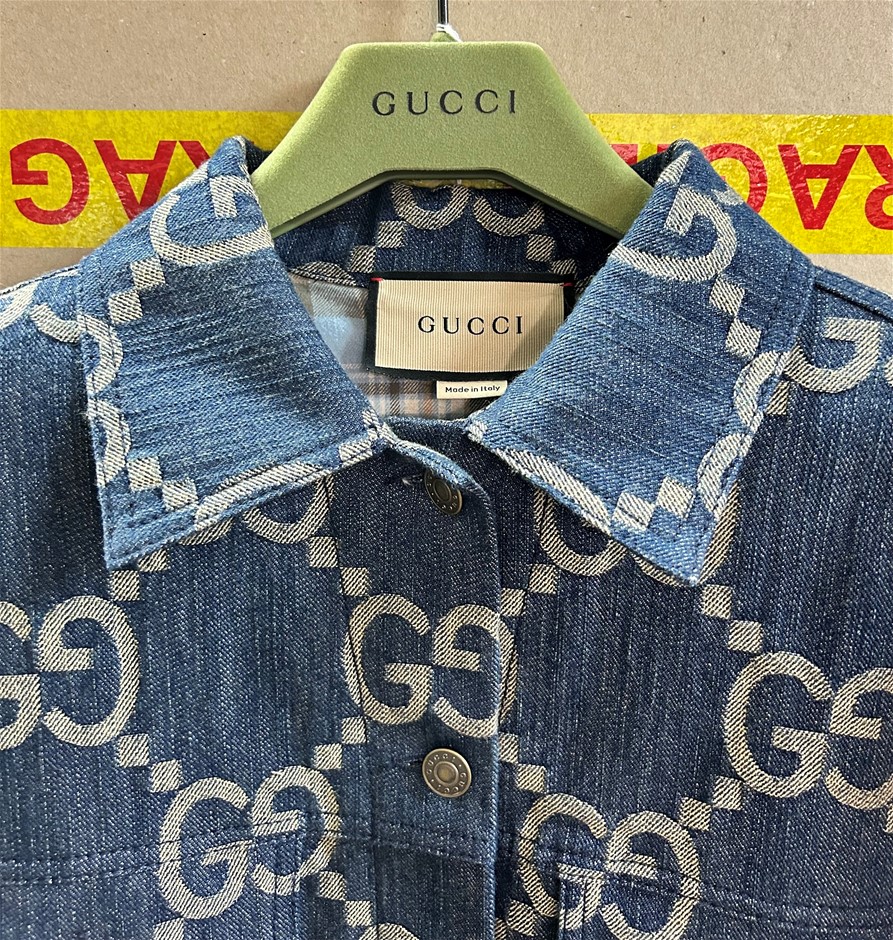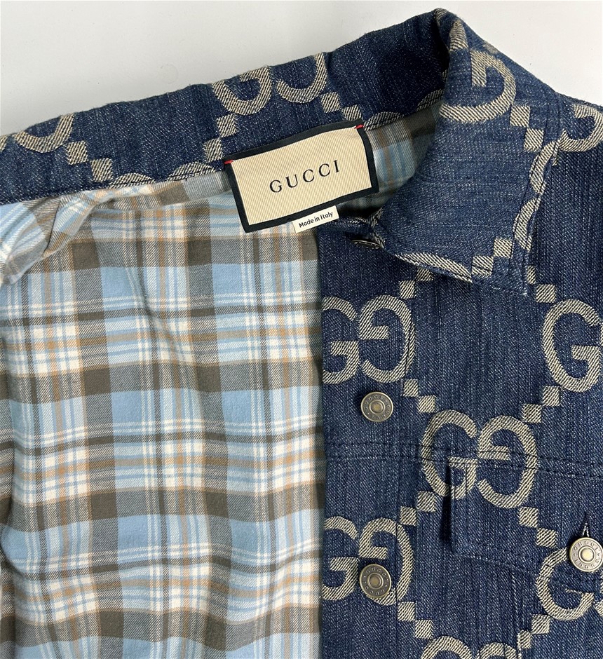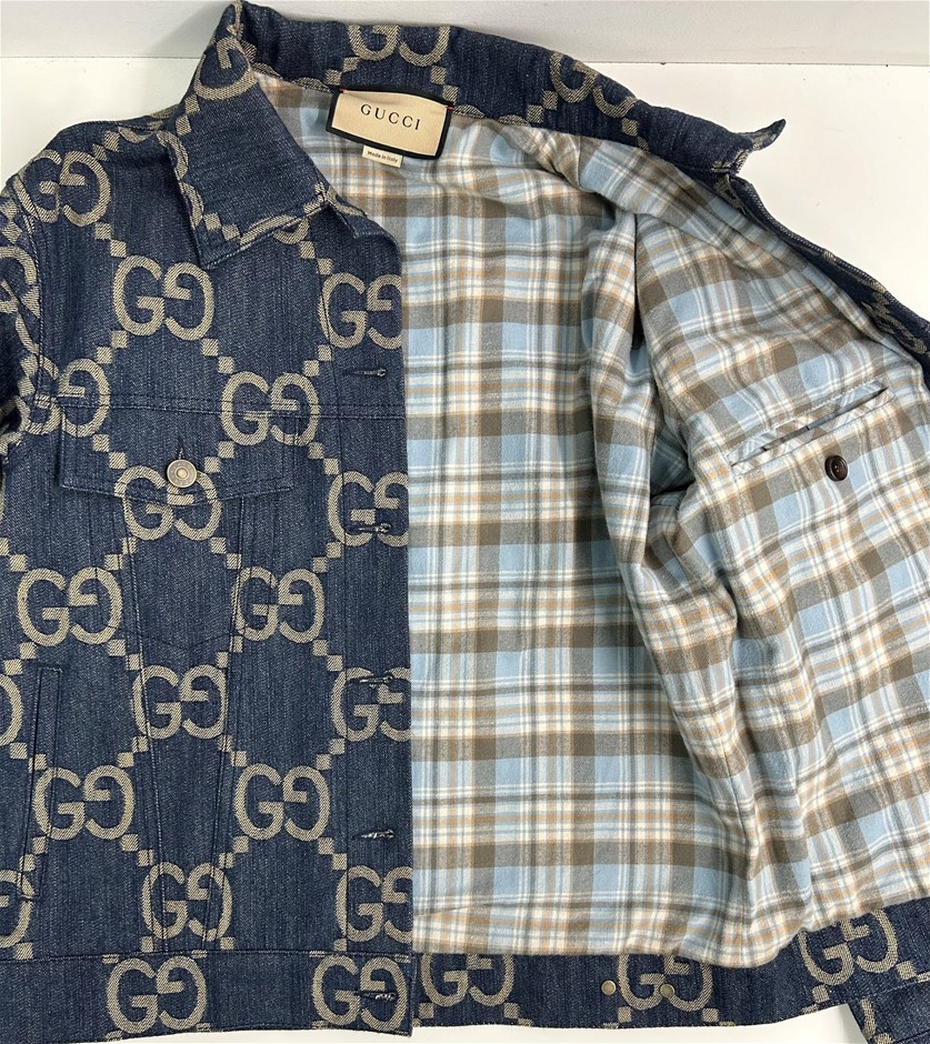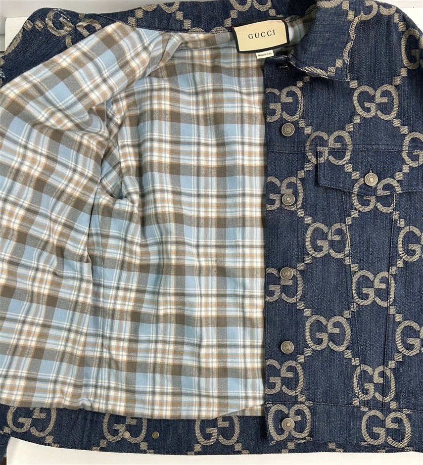 size 38 (160/84y), blue denim with GG motif, long sleeves with cuff & front 6 button closure, 2 front pockets, lined with blue/brown/cream checkered wool lining, 1 inside pocket with button closure, made in Italy, GUCCI coat hanger & garment cover with carry handles. This item has been professionally verified as a genuine product and comes with accompanying 3rd party Certificate of Authenticity (315864-195)