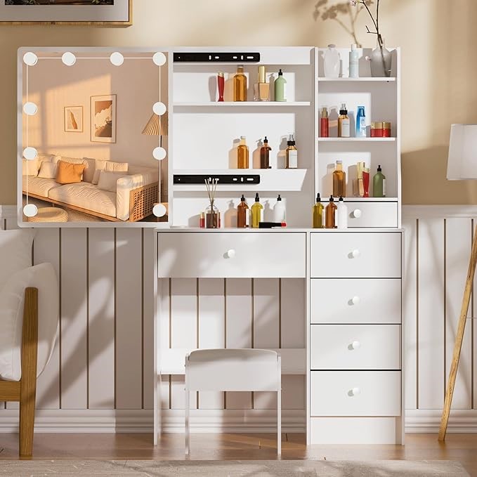 UMEIGA Makeup Vanity Desk and Chair Vanity Table Set with Lighted Mirror, 6