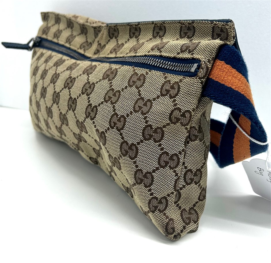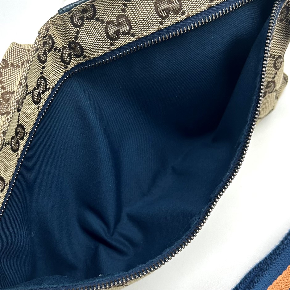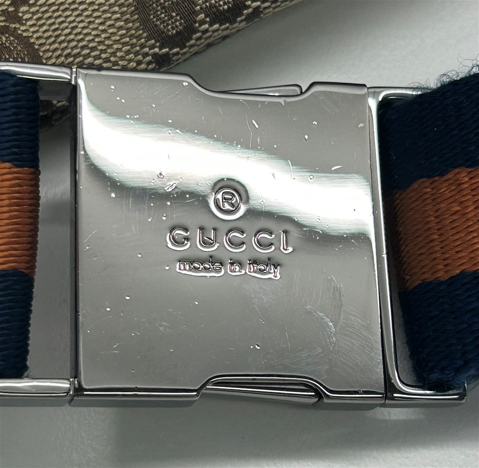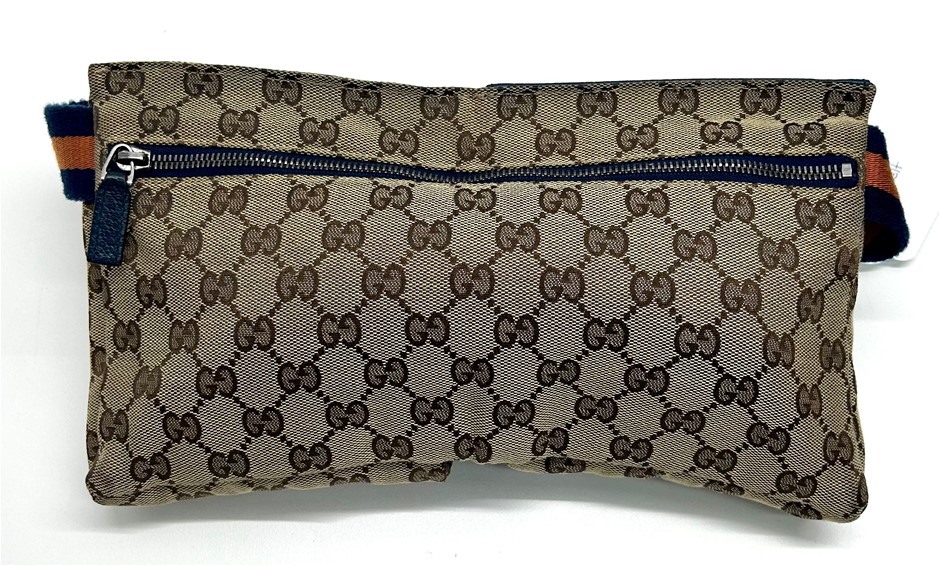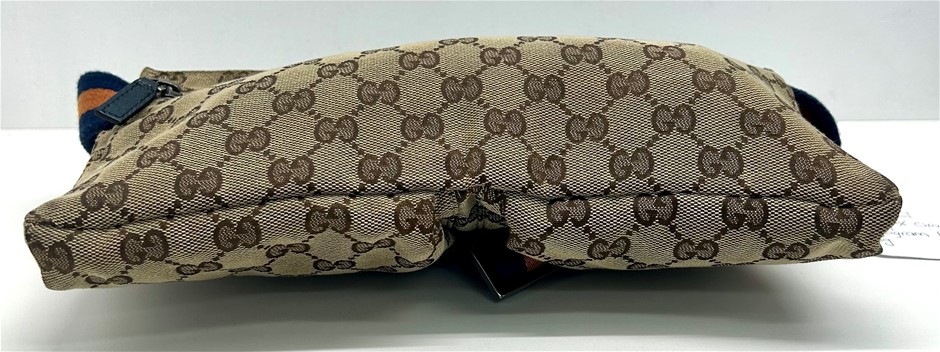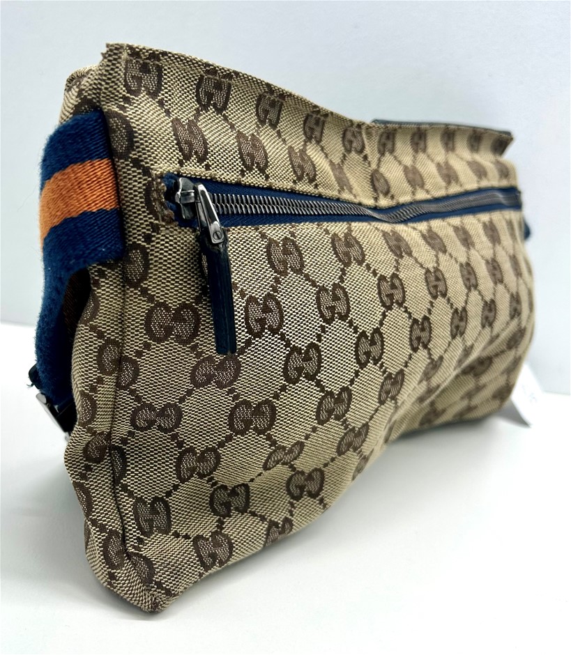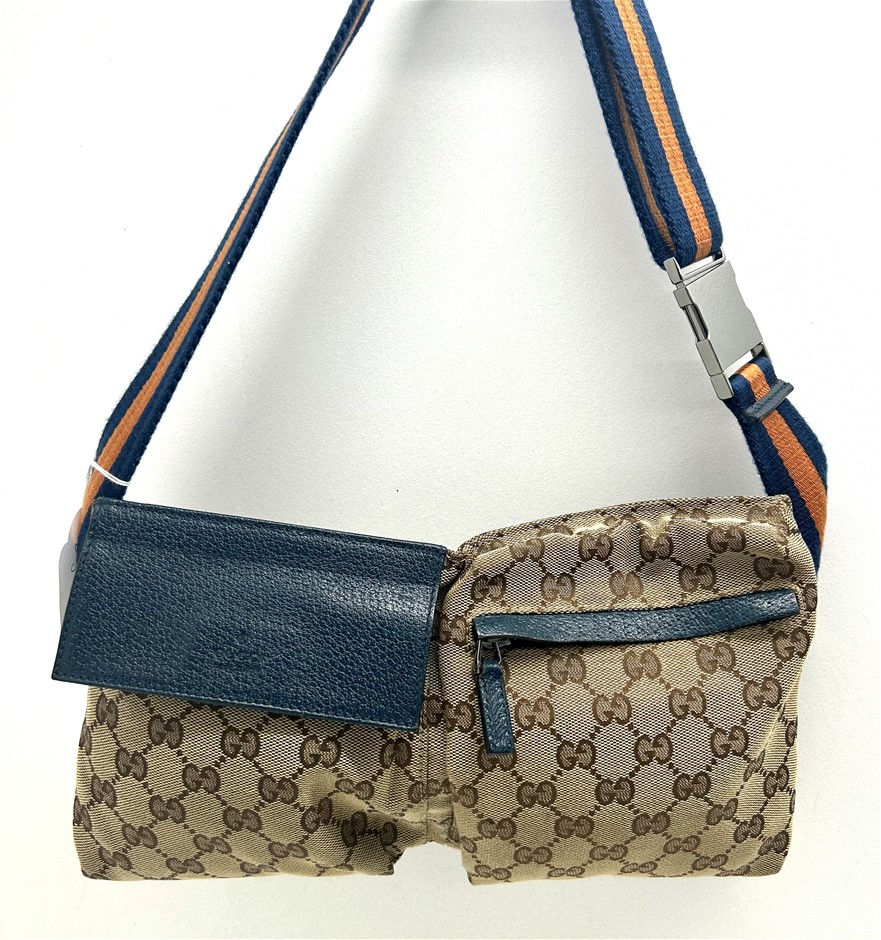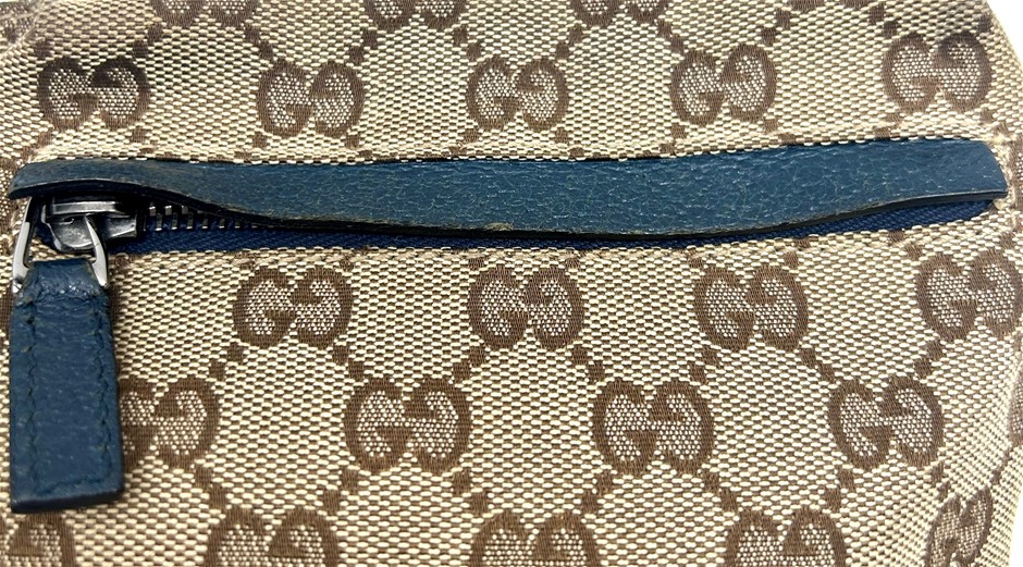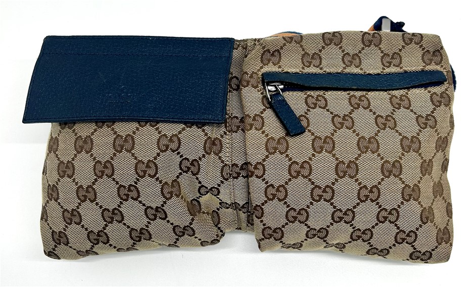 front blue leather fold over front pocket with Velcro fastening & 1 zip pocket, back zip pocket, web adjustable belt, silver tone hardware with GUCCI made in Italy engraved on fastening, measures 29 x 17.5 x 2.5cm, made in Italy. This item has been professionally verified as a genuine product and comes with accompanying 3rd party Certificate of Authenticity (304302-53)
