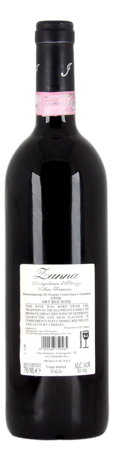 The **Illuminati Zanna Montepulciano d'Abruzzo Riserva DOCG 2008** is a mature and complex wine with depth and elegance. On the nose, it reveals rich aromas of dark cherries, dried plum, and blackberry, alongside earthy notes, tobacco, and a hint of leather. The palate is full-bodied and well-structured, with velvety tannins and balanced acidity that highlight flavors of ripe dark fruit, chocolate, and a touch of spice. The oak influence is well-integrated, adding complexity and subtle vanilla nuances. The finish is long and smooth, with lingering dark fruit and earthy undertones. A beautifully aged Montepulciano that showcases the richness and complexity of the Abruzzo region.