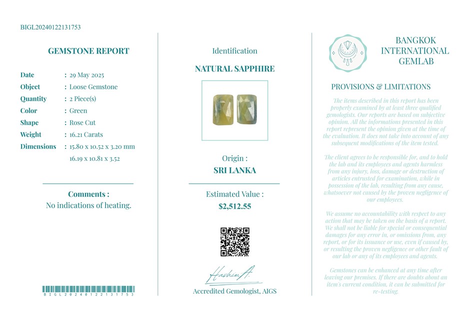 16.21 carats green sapphire Srilanka USD valuation $2512.55