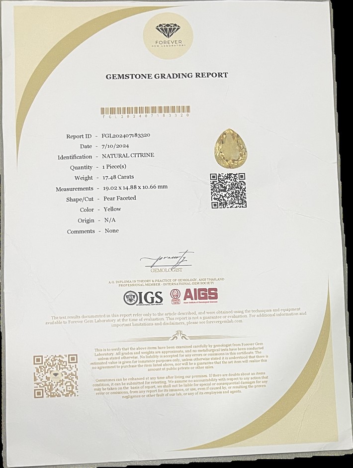 17.48 carat natural citrine gemstone certified