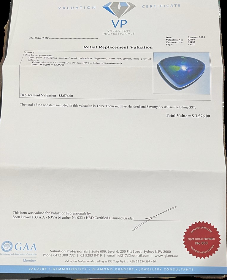 13.97 carat Ethopian opal with valuation $3576