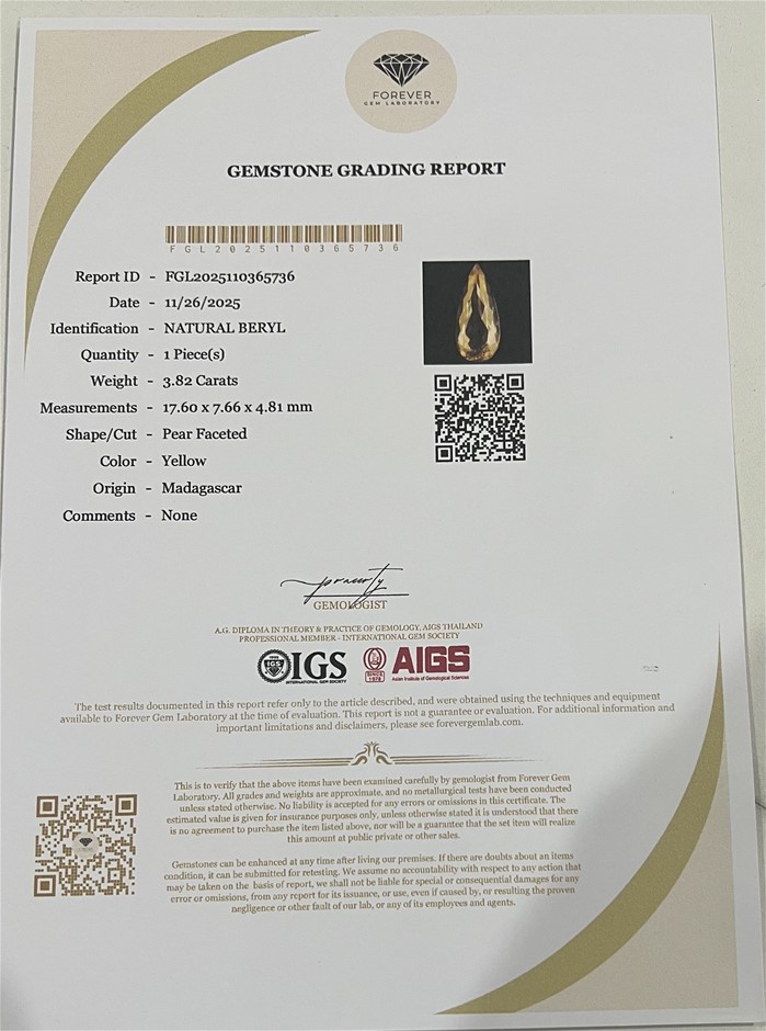 • 3.82 carats natural yellow Beryl certified