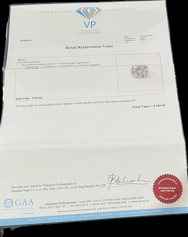 4.52 carat round mossainte ligh brown valuation $949