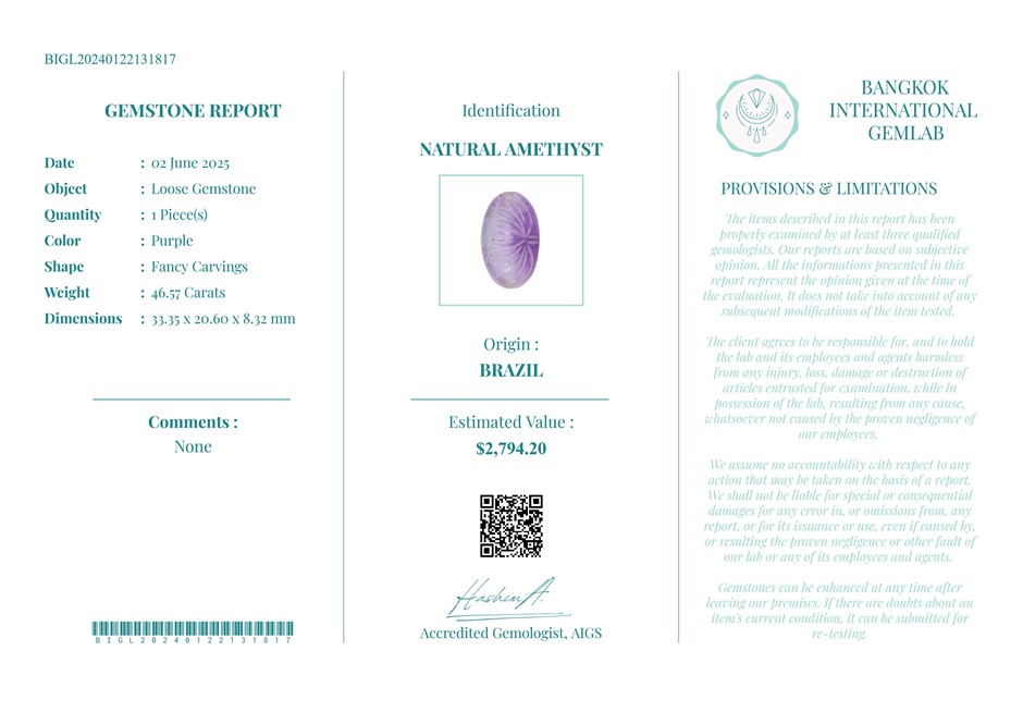 46.56 carats Natural Amethyst Certified USD Val: $2,794.20