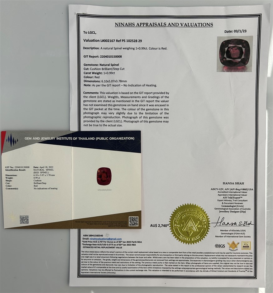 0.99ct Natural Red Spinel (Unheated), Cushion Brilliant Step Cut measuring 6.10 x 5.73 x 3.78mm.