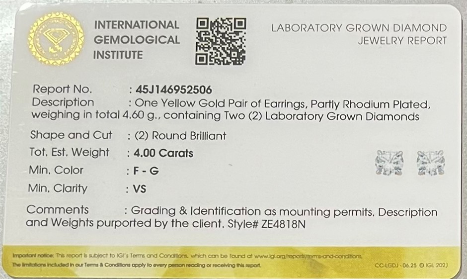 4 Carats Diamond Earrings in 18 ct Yellow Gold of 4.60 gram gold with IGI