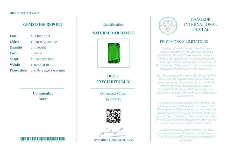 21.55 carats Natural Green Moldavite from Val Usd $2,693.75 from Czech Republic