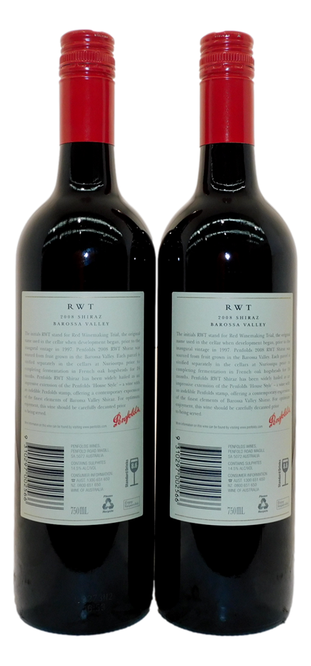 Penfolds `RWT` Shiraz 2008 (2 x 750mL), Barossa, SA.