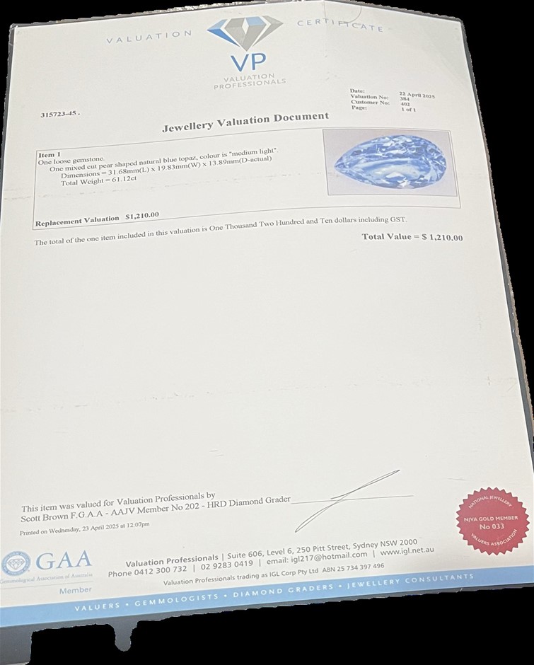 61.12 carat pear shaped blue topaz retail val: 1,210