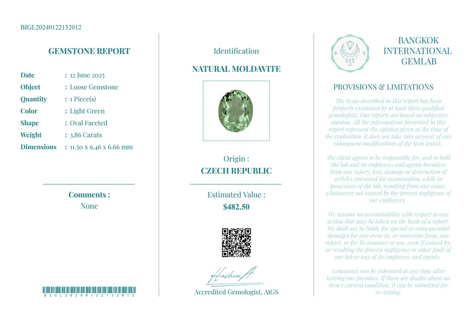 3.86 carat Natural Green Moldavite USD Val: $482.50