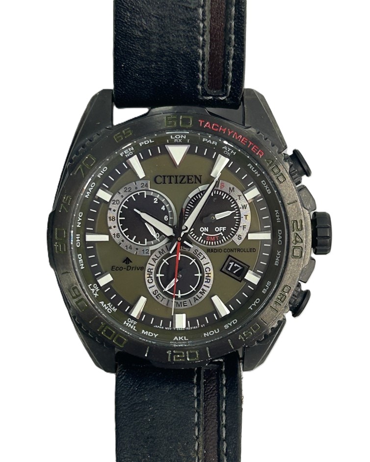 CITIZEN Eco-Drive Radio Controlled Watch, olive green dial with luminous hour markers & multi-function sundials, date display at 4 o’clock