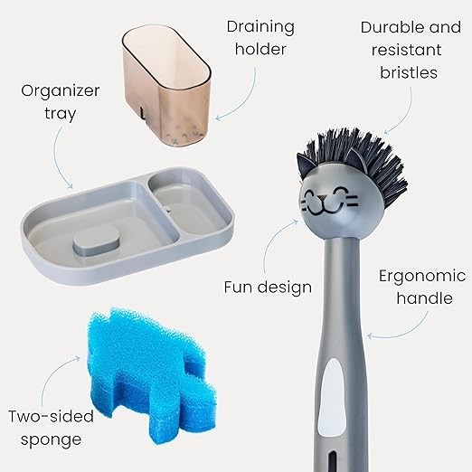 VIGAR Pets Club 3-in-1 Gray Cat Dish Brush, Blue Fish Sponge and Tray for Brush and Sponge Holder for Kitchen Sink, Sponges for Dishes Cat, Dog Bowls (Code: B0BS9XXHGT) (139719-104)