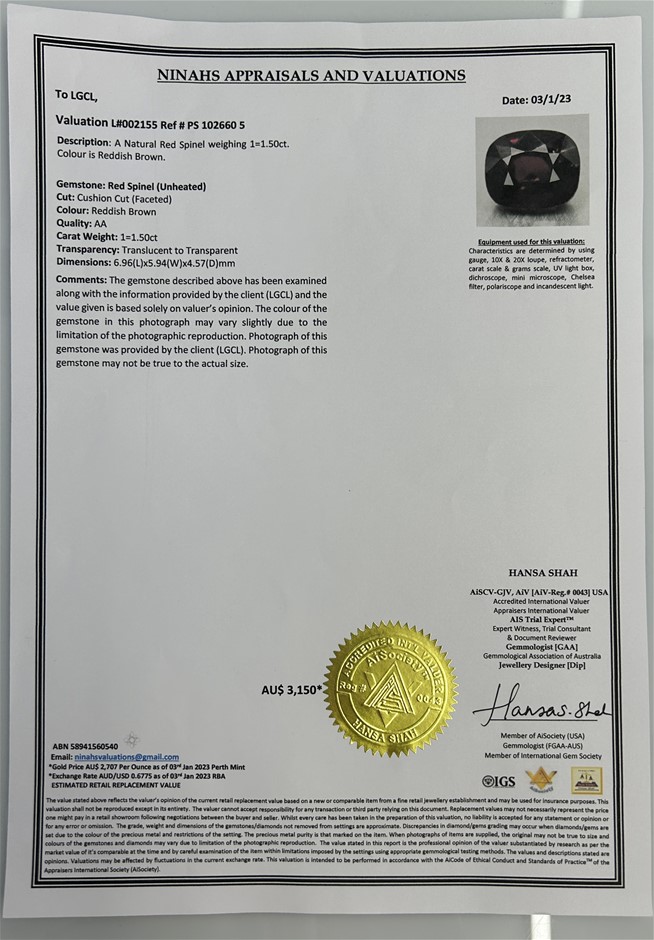• Includes Valuation Certificate $3,150.00