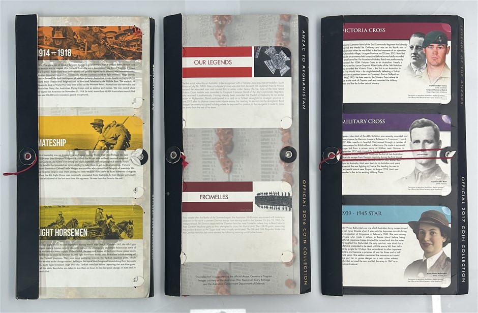 A collection of three official Royal Australian Mint ANZAC coin albums