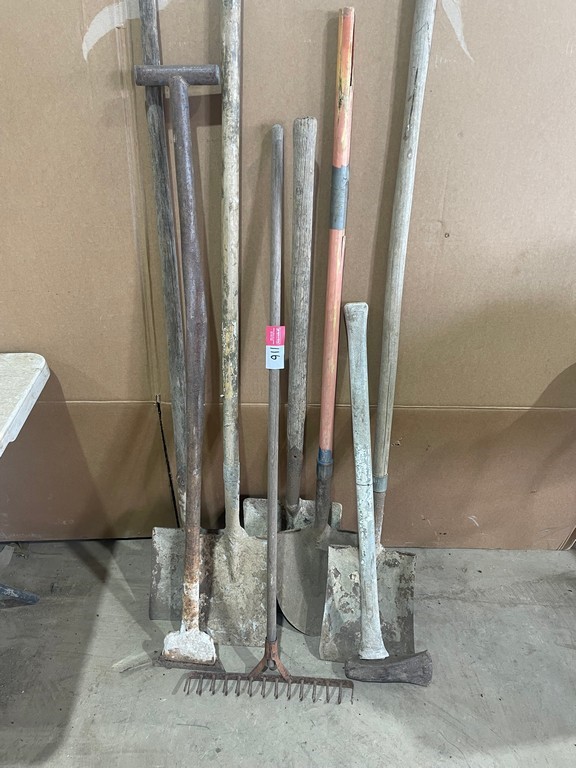 Qty of 8 Mixed Garden Tools - Shovels, Rakes, Bloc Splitter
