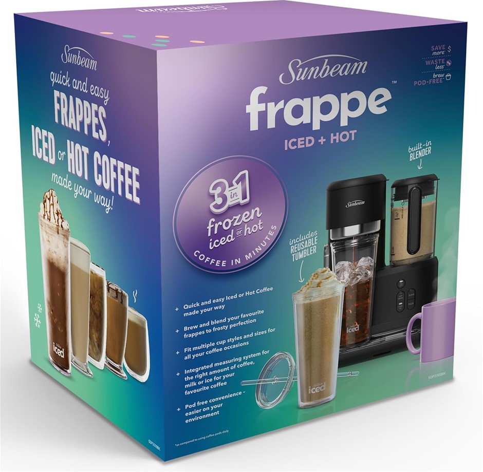 SUNBEAM 3-in-1 Frappe Iced and Hot Coffee Maker with Blender, Single Serve, with Reusable Filter, Scoop, 625mL Tumbler Set, Coffee Drink Recipes, Black SDP2000BK. NB: Has Been Used. (Code: B0DDYH9994-U) (334560-116)