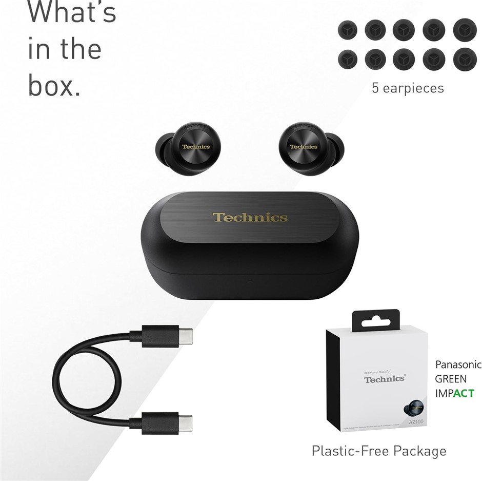 TECHNICS AZ100 True Wireless Noise Cancelling Bluetooth Earbuds with Magnetic Fluid Driver, Voice Focus AI, 3 Device Multipoint Connectivity, LDAC Compatible, Black (EAH-AZ100E-K). NB: Minor Use - test ok. (Code: B0DQPVJ74B-MU1) (139829-124)