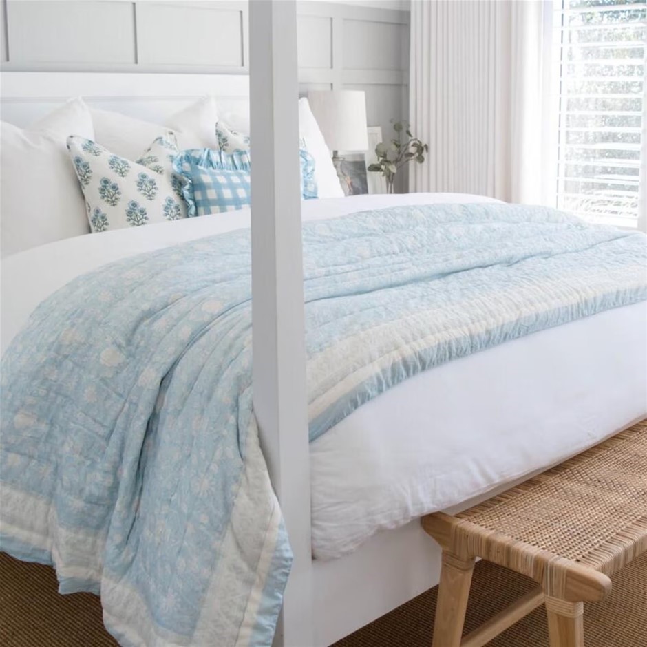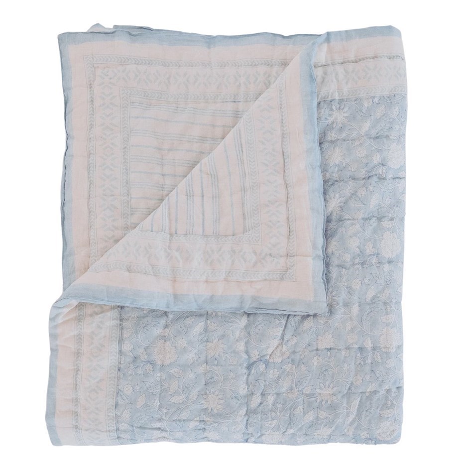 MISS SUNDARA Botanical Floral Block Print Quilt, Filled Reversible Side Pla