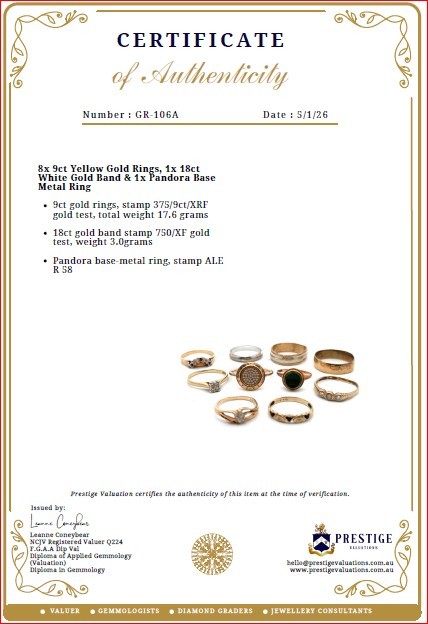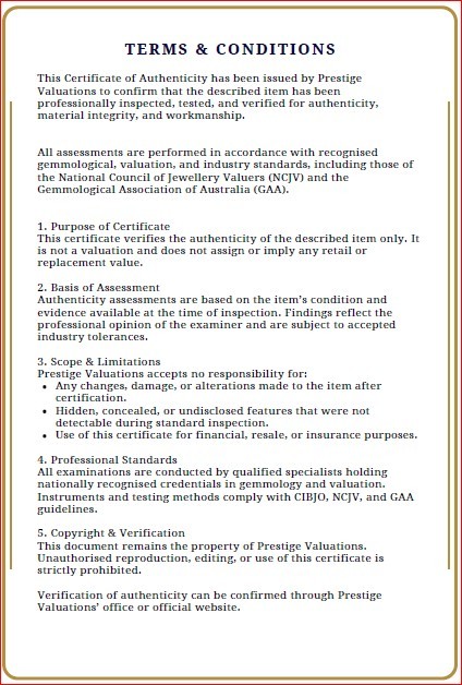 The Certificate of Authenticity means that the actual item for sale has been assessed by a fully qualified specialist jewellery valuer. The specialist jewellery valuer requires knowledge of gemmology, jewellery manufacture, precious metal markets, world gem markets, supply and demand factors both overseas and within Australia, taxation law requirements, general retail practices and the final combination of all the above factors in the principle and procedures of a jewellery valuation. They inspect and assess the jewellery item using a hand lens taking note of several key factors-