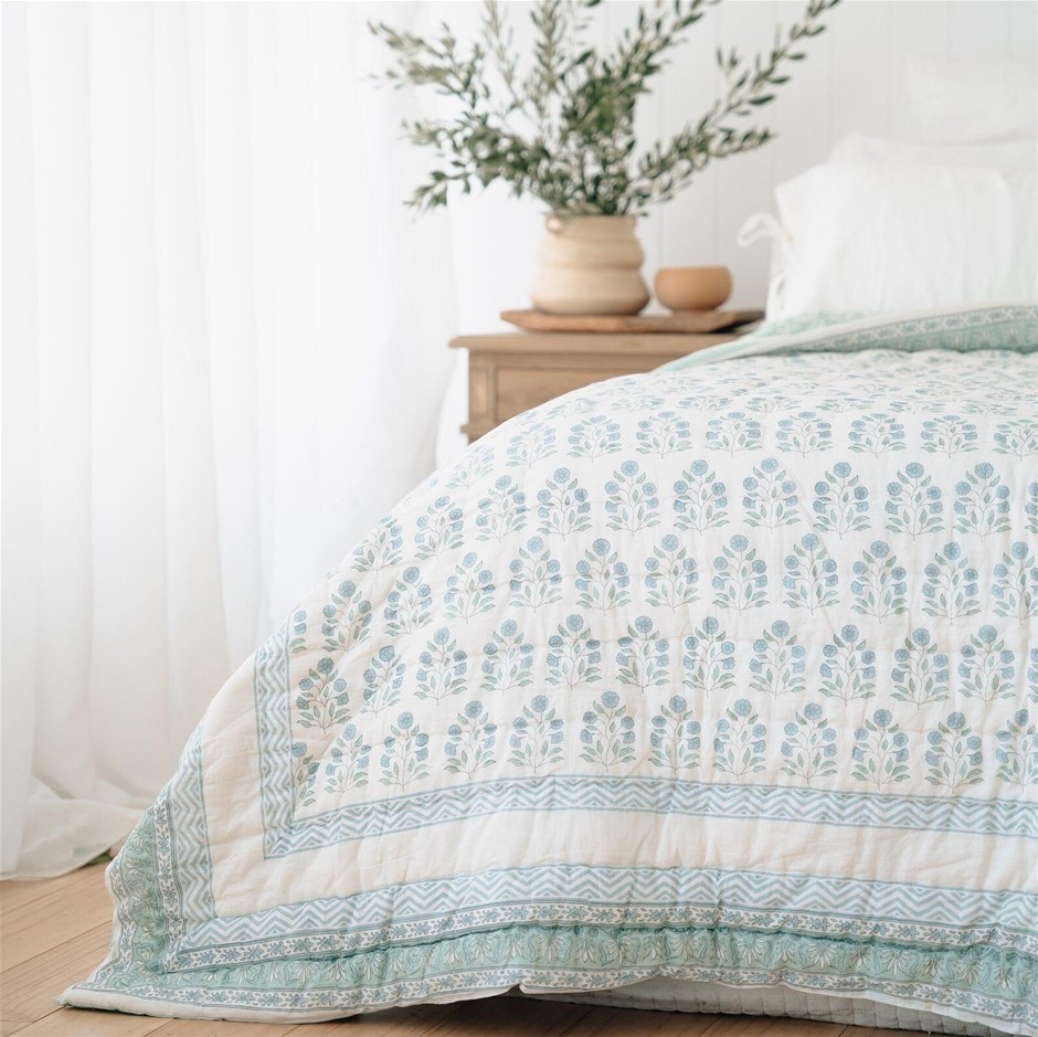 MISS SUNDARA Botanical Floral Block Print Quilt, Filled Reversible Side Pla