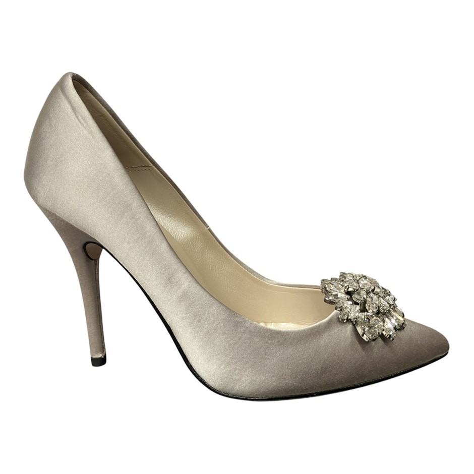 ALAN PINKUS Keisha Court Heels, Size 7.5, Silver Satin. RRP: $299. NB: glue under jewel may be slightly old/loosening. Buyers Note - Discount Freight Rates Apply to All Regional Areas(Code: B07F82FF1H-D1) (332832-129)