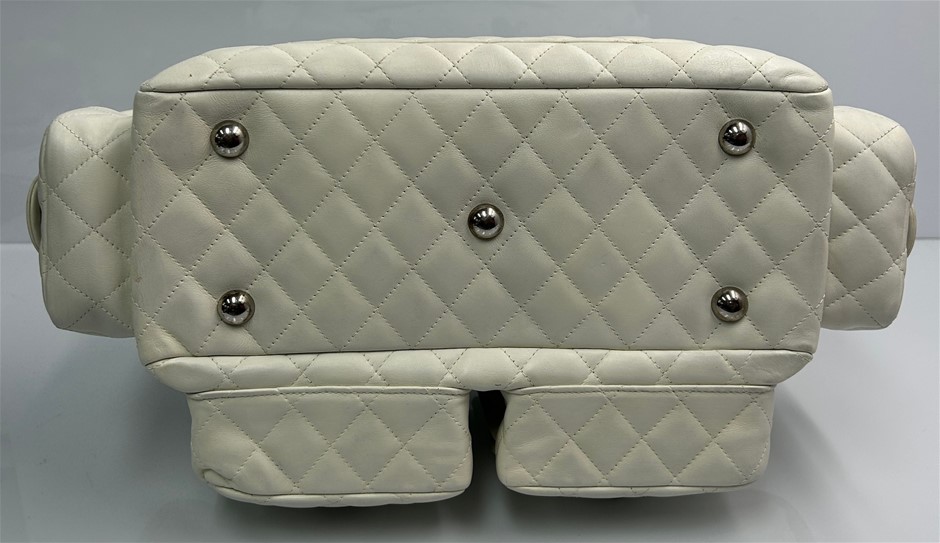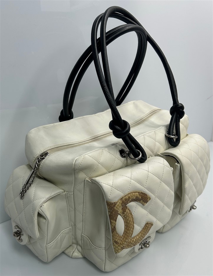 • Quilted cream calfskin leather with black double looped top handles & contrast python CC logo