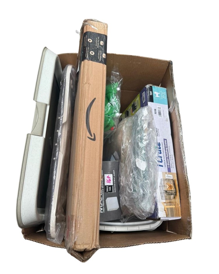 BOX OF ASSORTED PET ACCESORIES: Including Pet Gates, Cage, Bed, etc. NB: Photo as is (Code: CF00195) (139343-148)