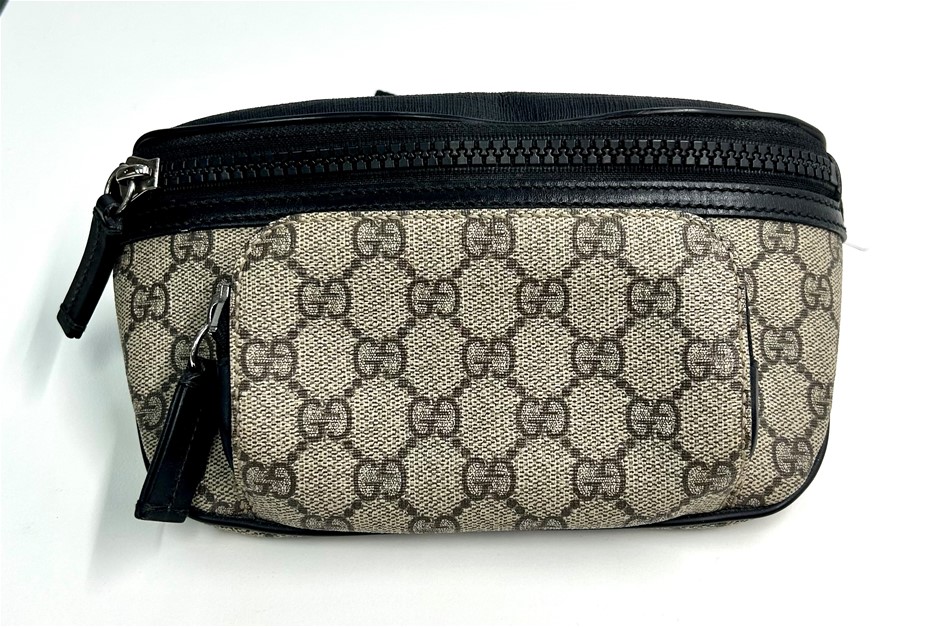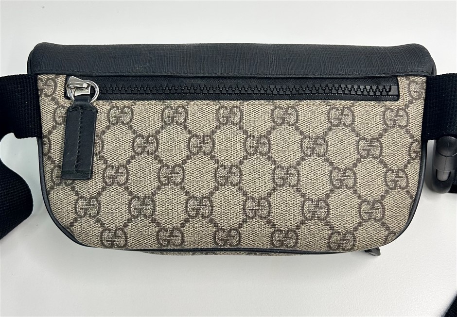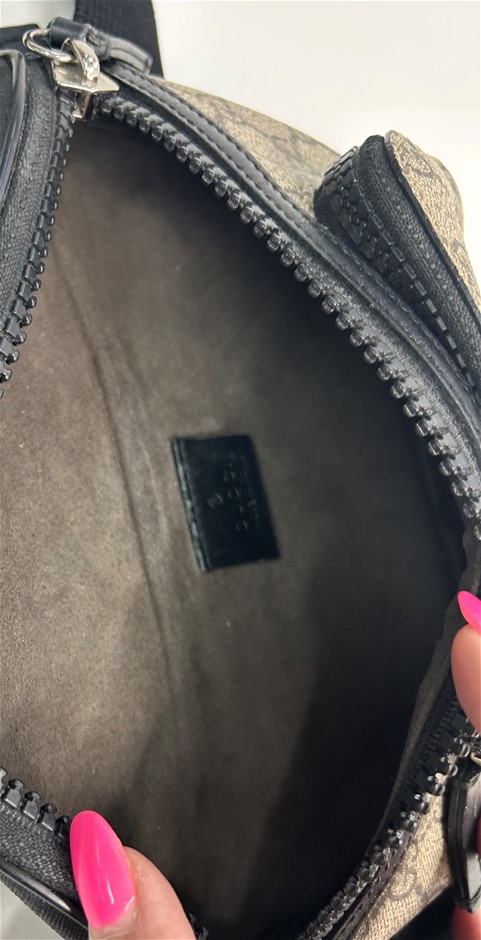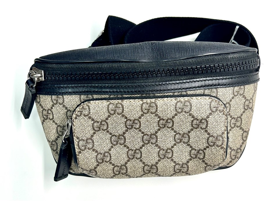 GG supreme beige coated monogram canvas & black leather trim, small front zipper pocket with zip around closure, black zip pocket with zip around closure, adjustable belt with 41cm drop & plastic buckle closure, palladium-toned hardware, Gucci trademark leather tag detail, brown microfibre lining, made in Italy, measures W:21cm x H:12cm x D:8.0cm. This item has been professionally verified as a genuine product and comes with accompanying 3rd party Certificate of Authenticity (306178-92)