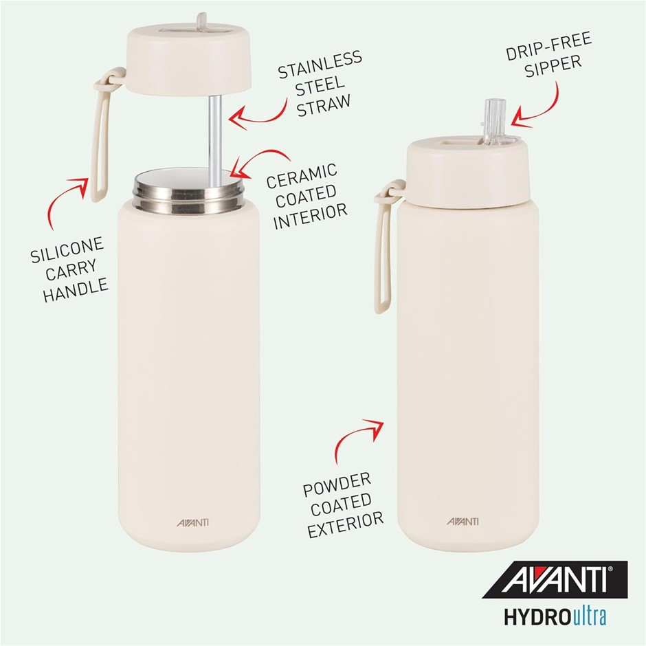 AVANTI HydroUltra Vacuum Water Bottle with Strap, Sand Dune, 1 Litre. NB: Some minor scuffs to exterior of bottle. (Code: B0F24H8GJ8-D1) (334064-166)