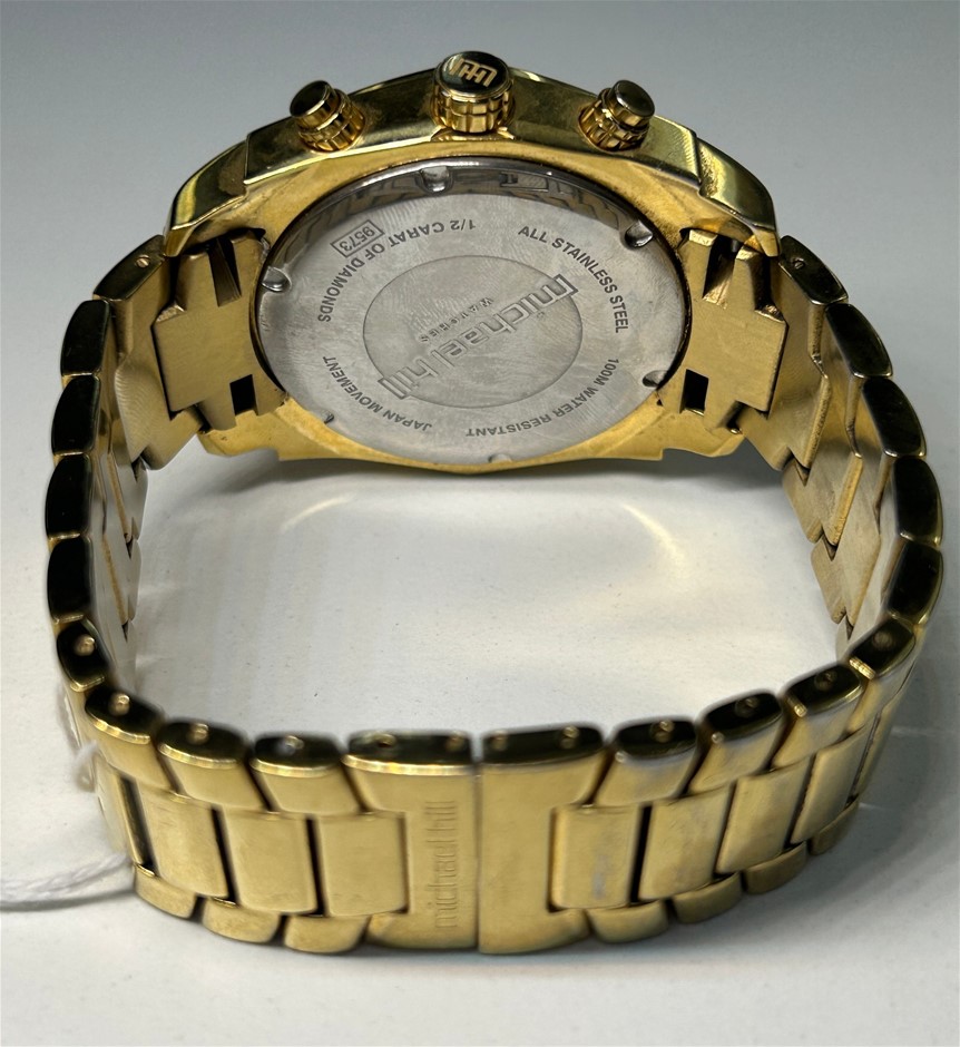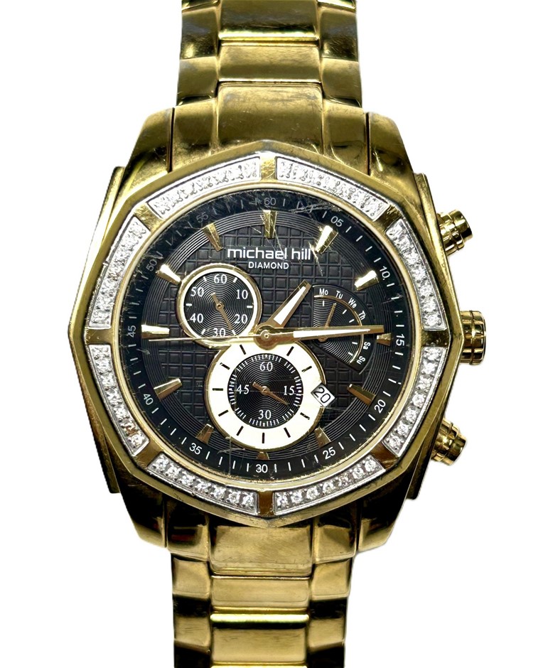 • MICHAEL HILL Diamond Chronograph Watch, model 9573, black dial, gold tone baton hour markers, date display, 0.50ct round brilliant cut diamonds grain set around the bezel, case measures 45mm, WR100m, quartz movement, gold tone stainless steel bracelet with double deployment clasp.