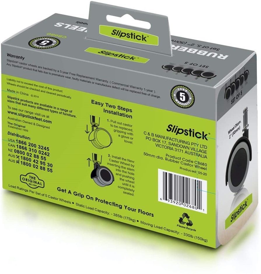 SLIPSTICK 2`` Floor Protecting Rubber Office Chair Caster Wheels (Set of 5), BLACK. NB: Minor Use. (Code: B006LY4K7S-MU) (139372-173)