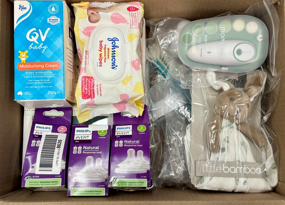 9 x Assorted Baby Products, PHILIPS, QV BABY, LITTLE LINEN & More, Comprisng: Bottles, Teats, Electric Nail File, Muslin Swaddle/Wraps & More. NB: Photos as is, Some products slightly damaged packaging, Some not in original packaging & 1 x Little Bamboo detergent spilt, small area.(Code: B02Z10385-B26) (334560-184)