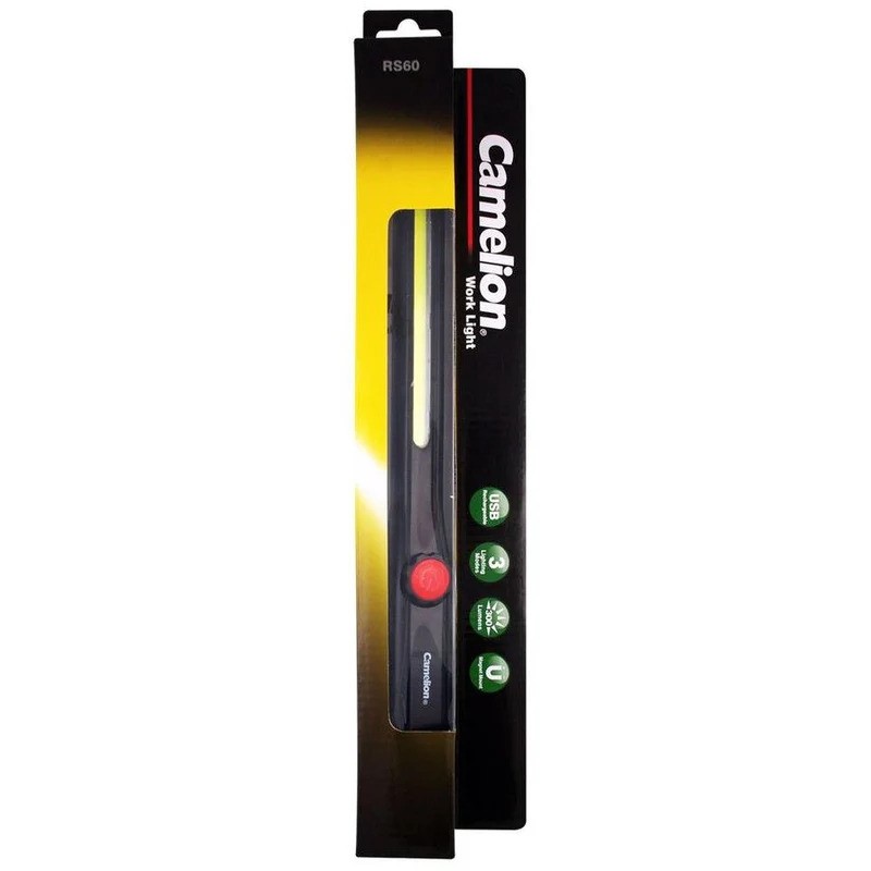 • Camelion 5W Cob Rechargeable Wand Work light has Ultra bright 300 lumens and a Slim and durable design with 3 lighting modes it also features Adjustable brightness with easy to use rotary switch and Adjustable swivel base with a Hight strength magnet it`s also Rechargeable with micro USB.