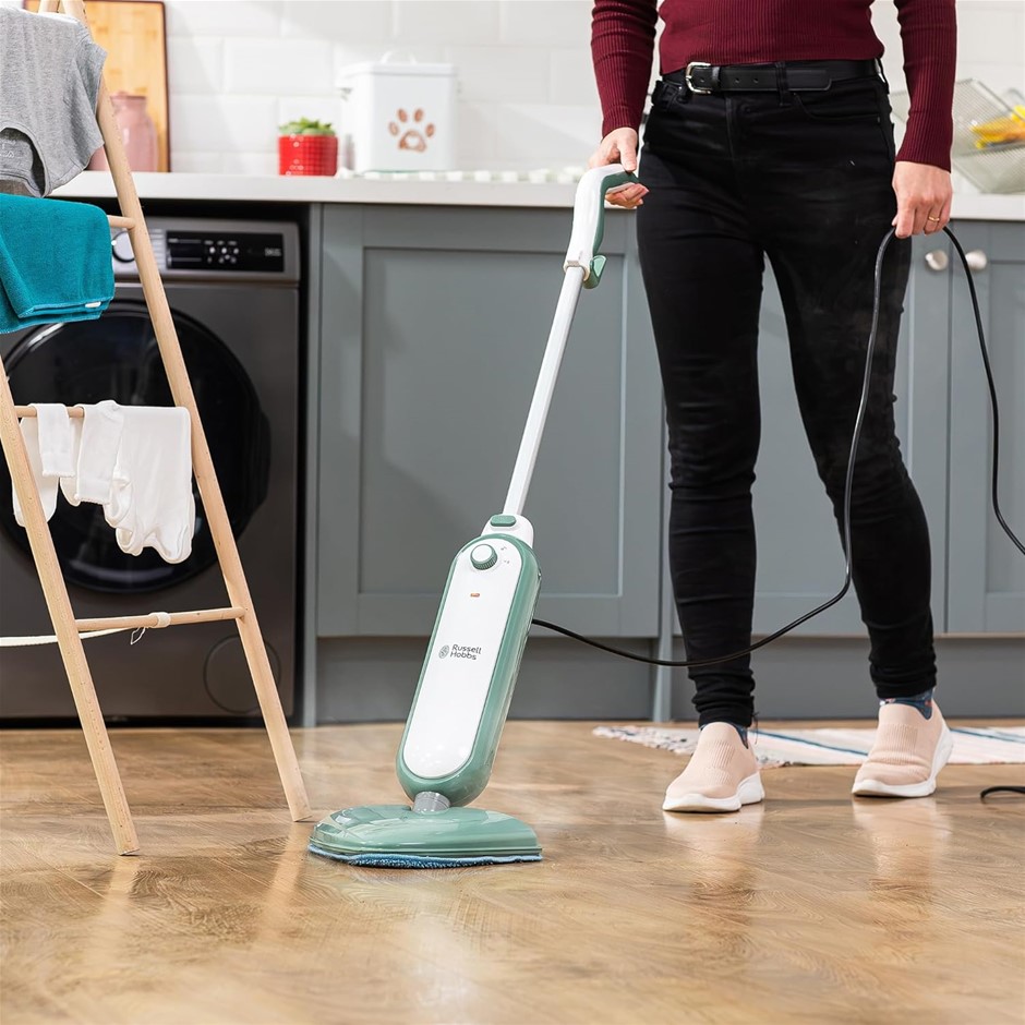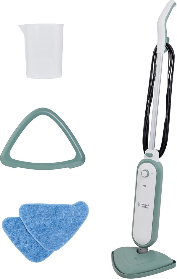 Russell Hobbs Steam & Clean Steam Mop, RHSM1001-SG-AU, 8m Power Cord, Lightweight, 15 Minute Steam Time, Chemical-Free Cleaning, Sage Green. NB: Slightly damaged box during storage. (Code: B0FP4N3QJ3-NE-SD1) (334423-203)