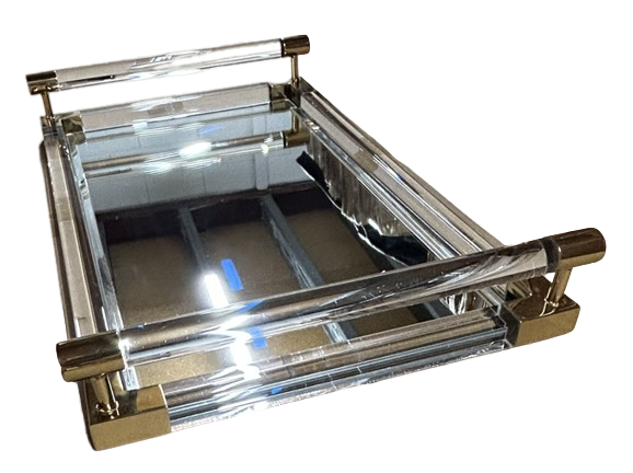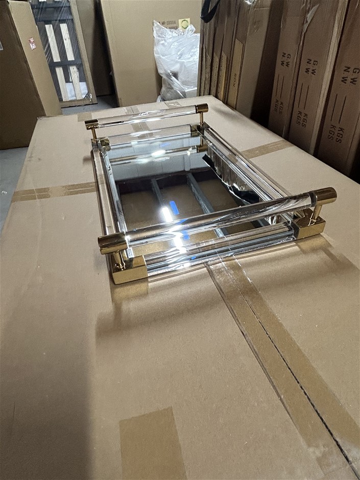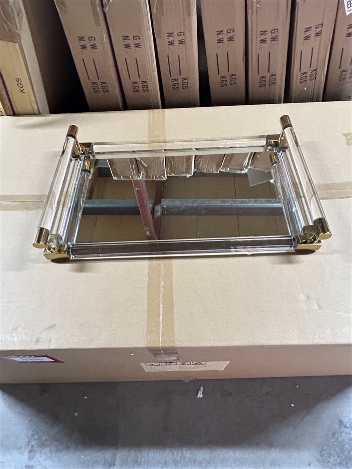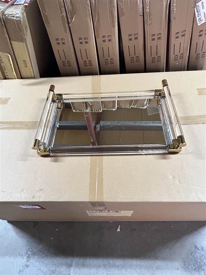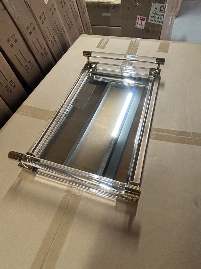 Qty 7 x Clear Acrylic Gold Trim Serving Trays with Mirror Base