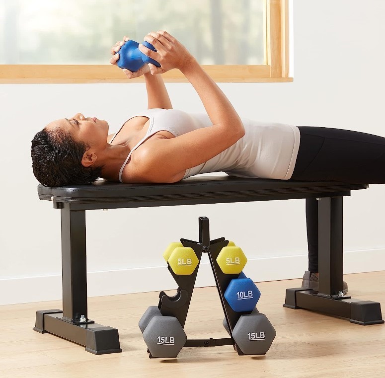 AMAZON BASICS Neoprene Coated Hexagon Workout Dumbbell Color Coded Hand Weight with Storage Rack, 60 Pounds (3 Pairs of 5, 10, and 15 Pounds), Green/Blue/Grey. (Code: B02Z132249) (330854-205)